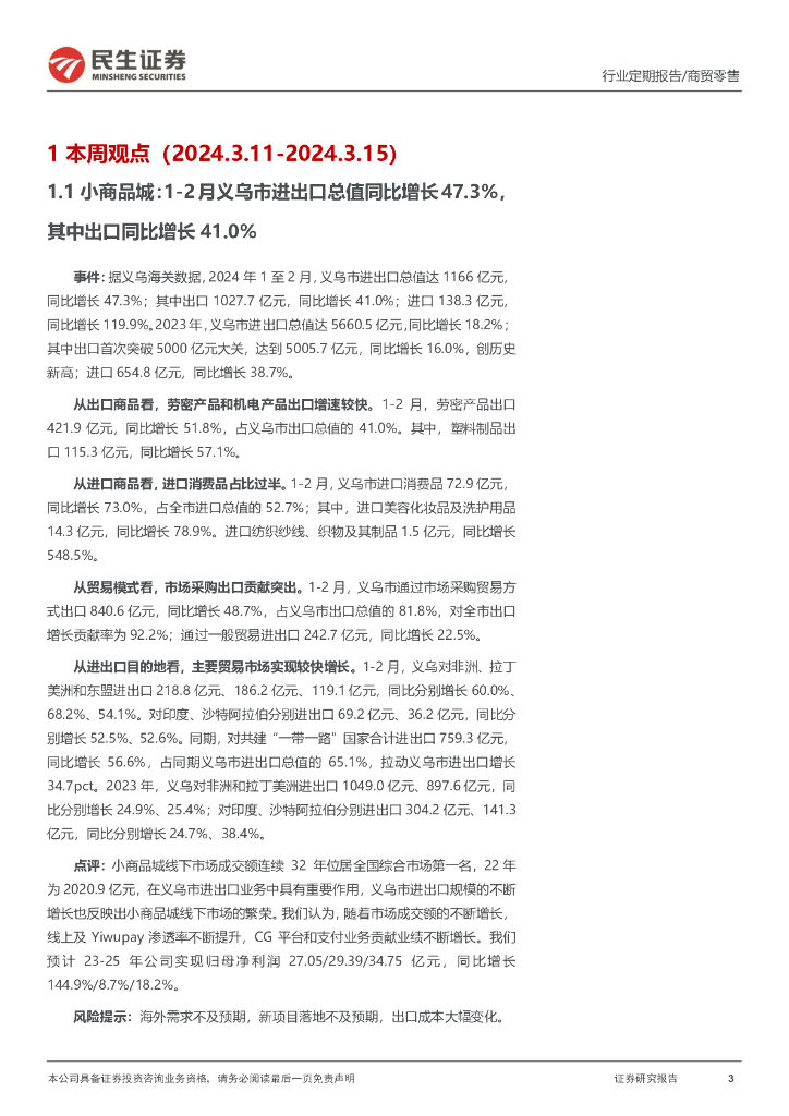 民生证券:零售周观点:1-2月义乌市进出口景气度提升同增47%,印度培育钻石毛坯进口额同比转正,积极关注产业变化.pdf