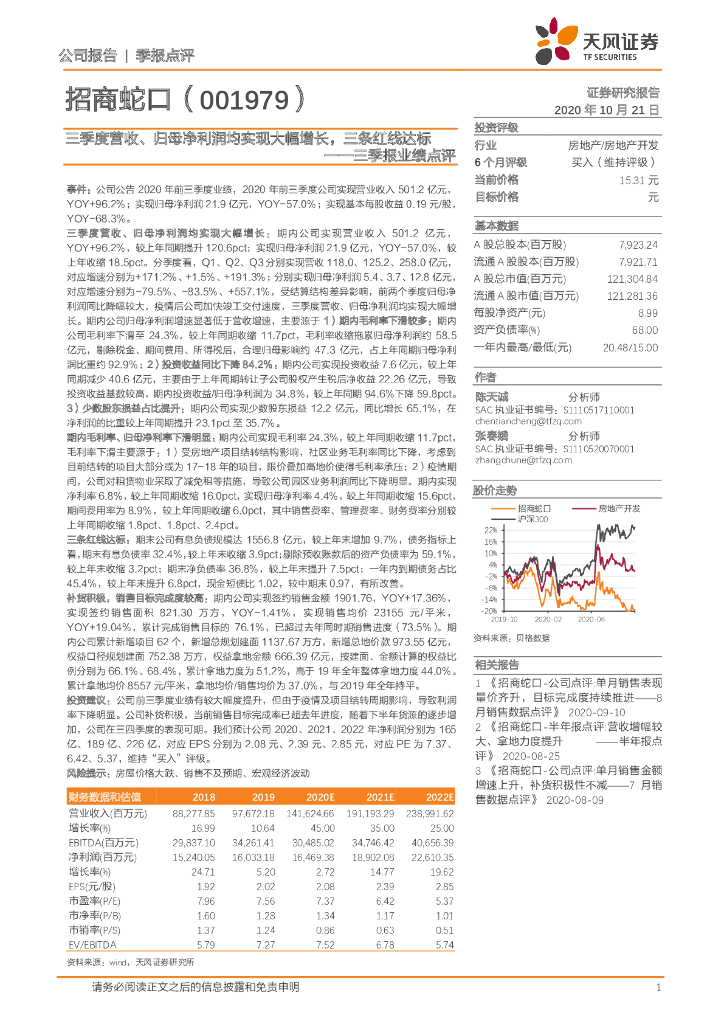 天风证券:招商蛇口(001979)-三季报业绩点评:三季度营收、归母净利润均实现大幅增长,三条红线达标.pdf