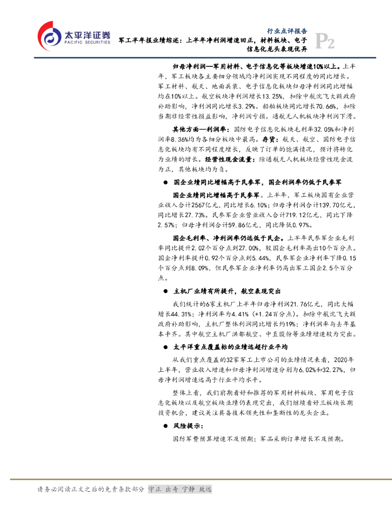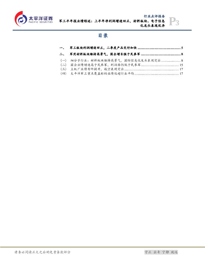 太平洋证券:军工半年报业绩综述:上半年净利润增速回正,材料板块、电子信息化龙头表现优异.pdf