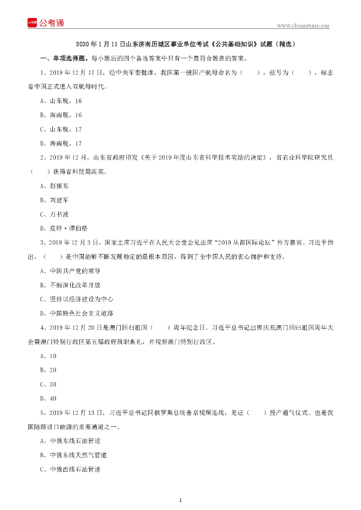2020年1月11日山东济南历城区事业单位考试《公共基础知识》试题(精选).pdf