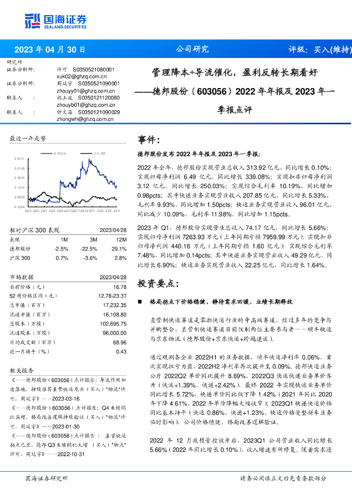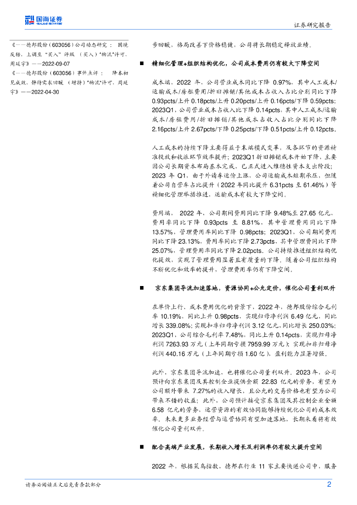 国海证券:德邦股份(603056)-2022年年报及2023年一季报点评:管理降本+导流催化,盈利反转长期看好.pdf