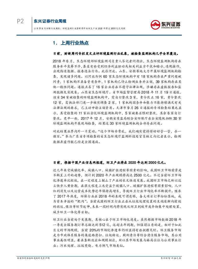 东兴证券:公用事业及环保行业周报:环境监测行业整顿将开始 环卫产业2020年将达2000亿元规模.pdf