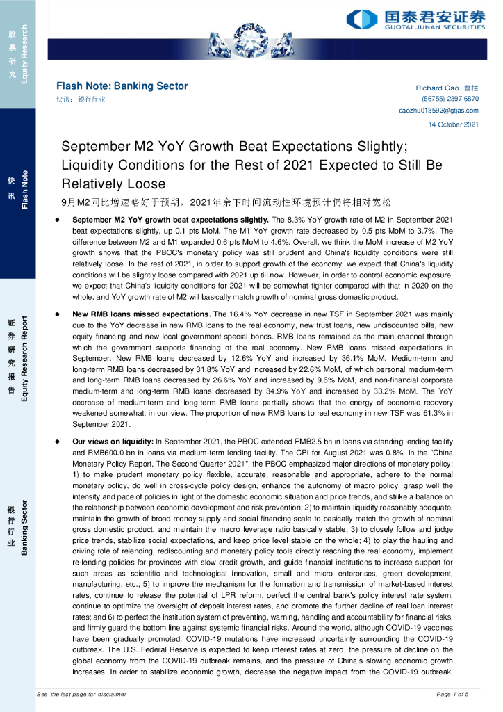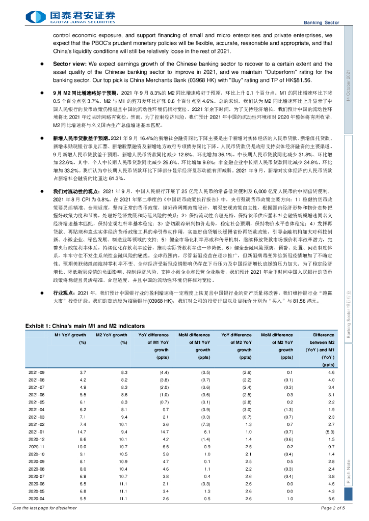 国泰君安证券(香港):银行业:9月M2同比增速略好于预期,2021年余下时间流动性环境预计仍将相对宽松.pdf