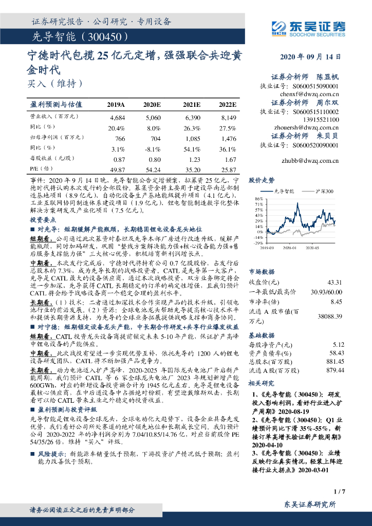 东吴证券:先导智能(300450)-宁德时代包揽25亿元定增,强强联合共迎黄金时代.pdf