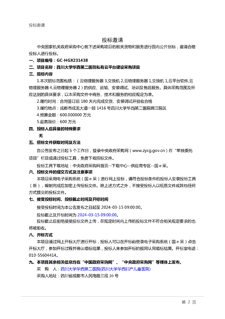 四川大学华西第二医院(四川大学华西妇产儿童医院):《私有云平台建设采购项目》招标公告.pdf