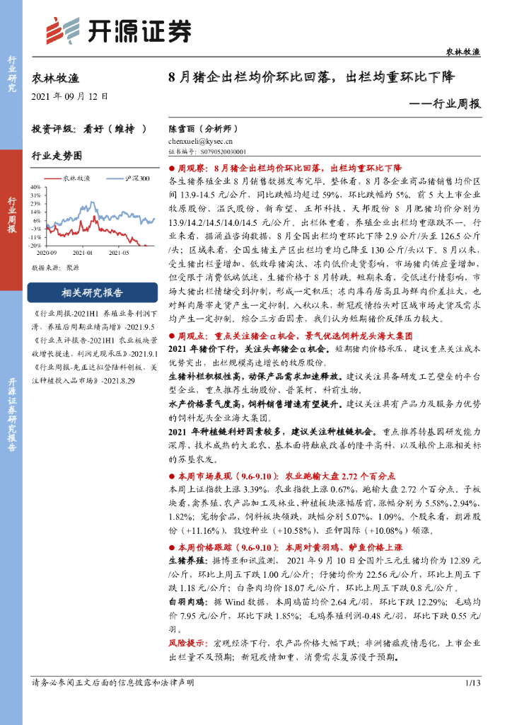 开源证券:农林牧渔行业周报:8月猪企出栏均价环比回落,出栏均重环比下降.pdf