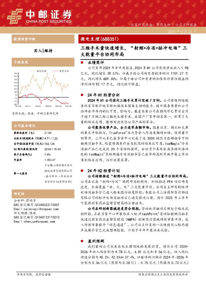 中邮证券:微电生理(688351)-三维手术量快速增长,“射频+冷冻+脉冲电场”三大能量平台协同布局.pdf