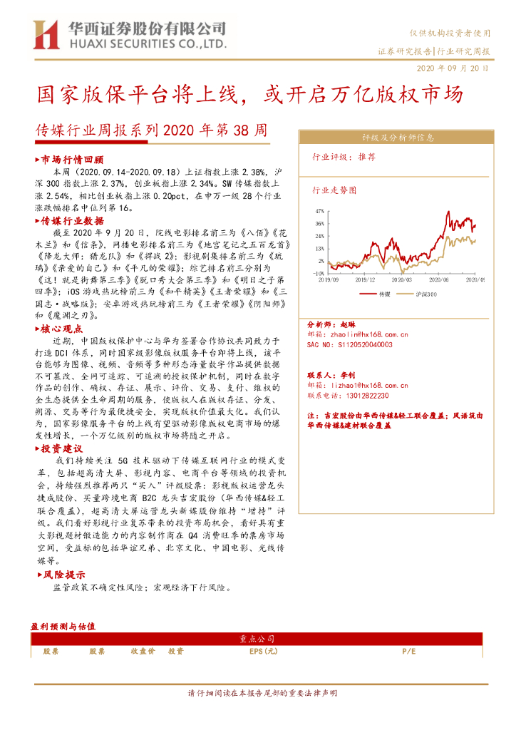 华西证券:传媒行业周报系列2020年第38周:国家版保平台将上线,或开启万亿版权市场.pdf