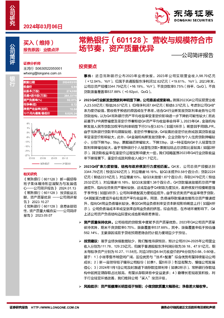 东海证券:常熟银行(601128)-公司简评报告:营收与规模符合市场节奏,资产质量优异.pdf