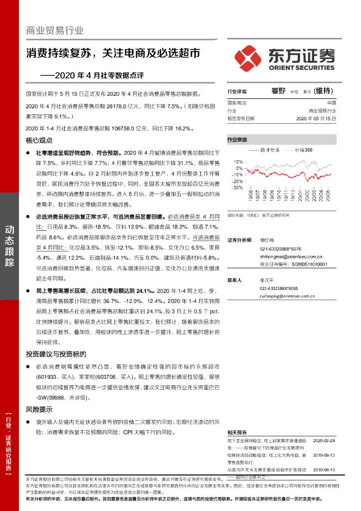 东方证券:商业贸易行业2020年4月社零数据点评:消费持续复苏,关注电商及必选超市.pdf