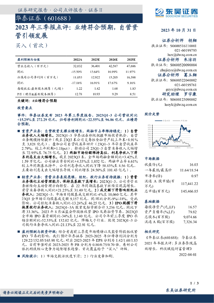 东吴证券:华泰证券(601688)-2023年三季报点评:业绩符合预期,自营资管引领发展.pdf