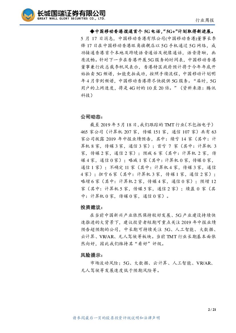 长城国瑞证券:TMT行业双周报2019年第10期(总第69期):华为被美国商务部列入“实体清单”,中国移动香港拨通首个5G电话.pdf