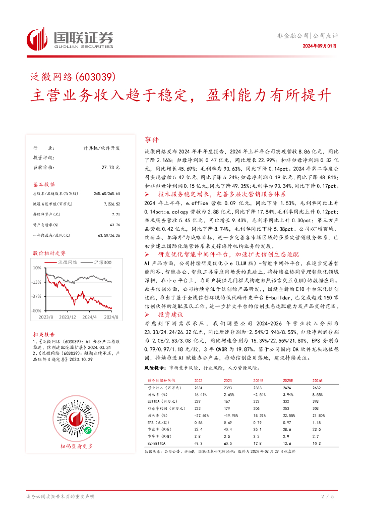 国联证券:泛微网络(603039)-主营业务收入趋于稳定,盈利能力有所提升.pdf