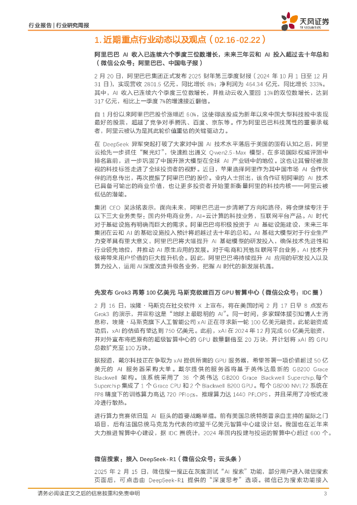 天风证券:通信行业研究周报:阿里未来三年云和AI投入超过去十年,Grok3将再筹100亿美元.pdf