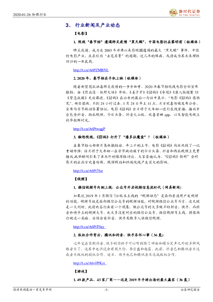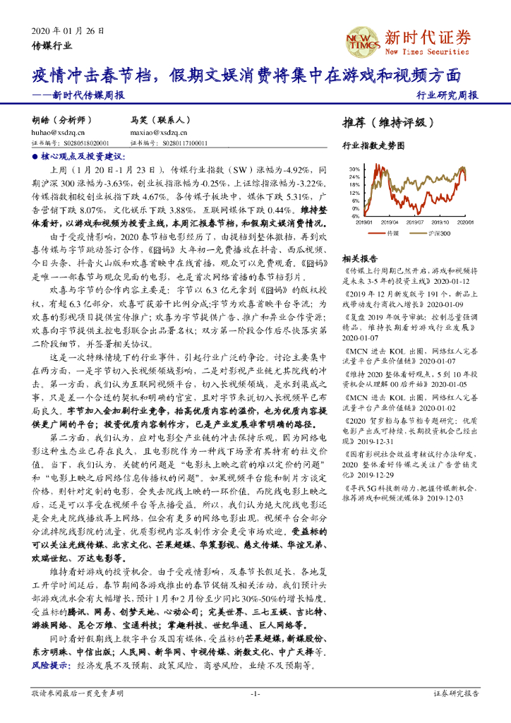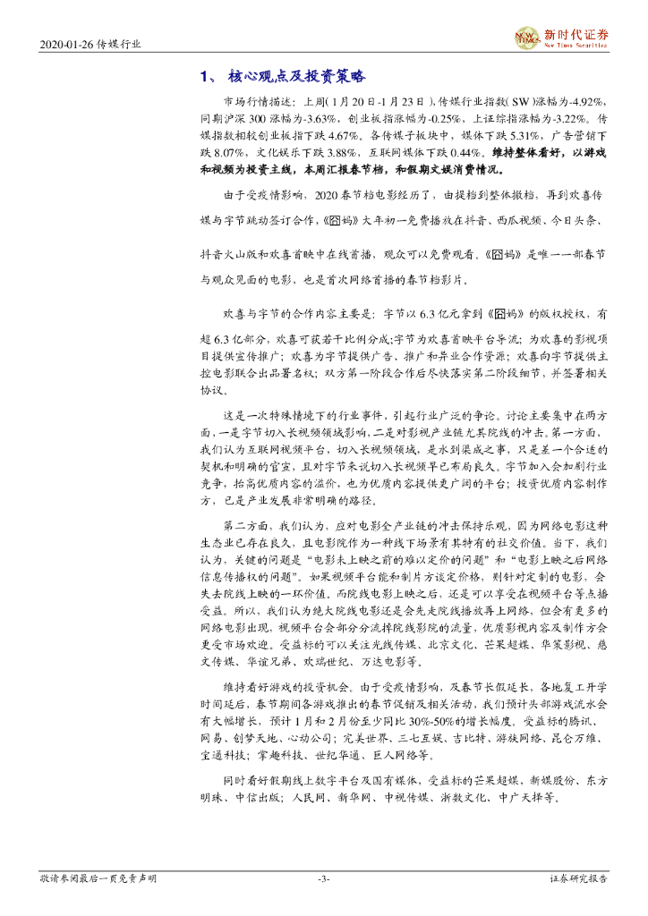 新时代证券:新时代传媒周报:疫情冲击春节档,假期文娱消费将集中在游戏和视频方面.pdf