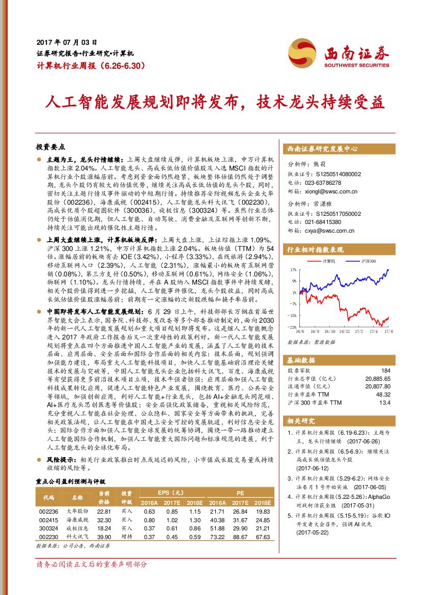西南证券:计算机行业周报:人工智能发展规划即将发布,技术龙头持续受益.pdf