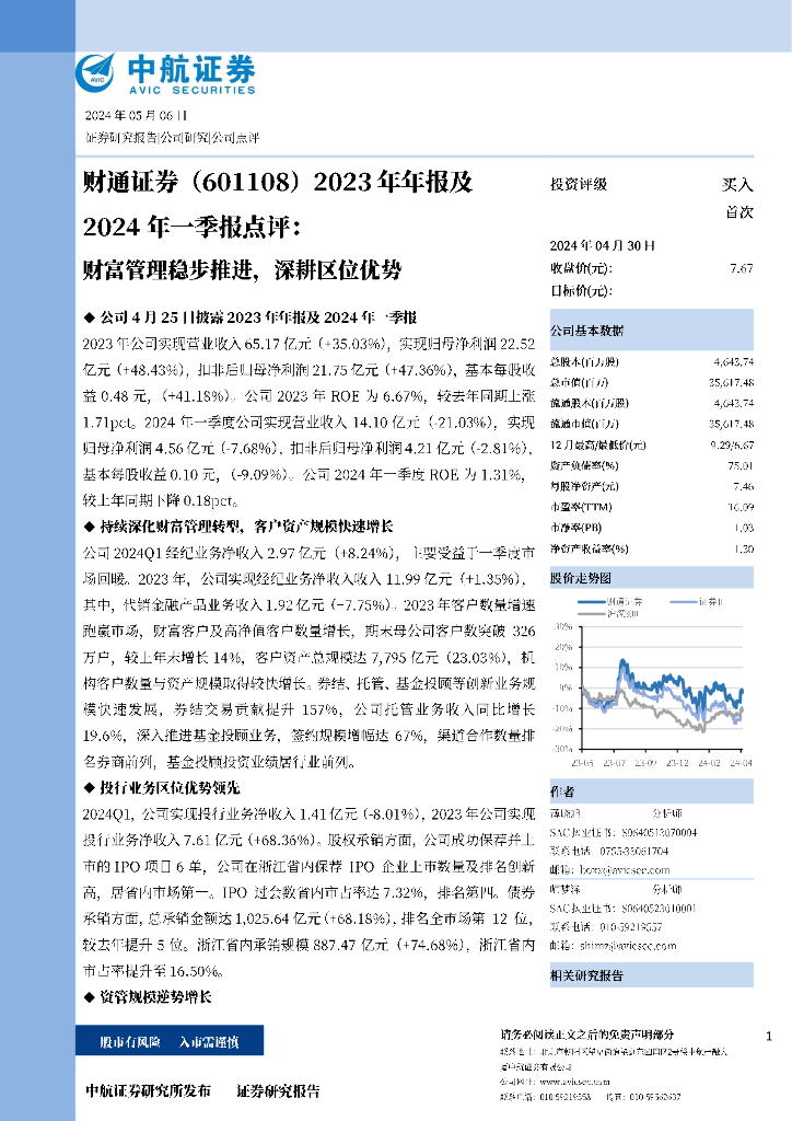 中航证券:财通证券(601108)-2023年年报及2024年一季报点评:财富管理稳步推进,深耕区位优势.pdf