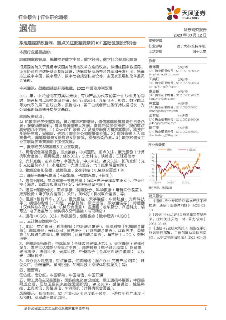 天风证券:通信行业研究周报:拟组建国家数据局,重点关注数据要素和ICT基础设施投资机会.pdf
