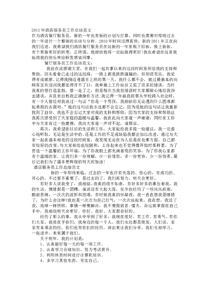 2011年酒店服务员工作总结范文.doc