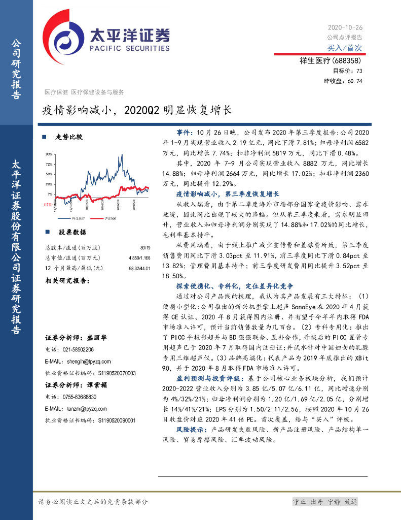 太平洋证券:祥生医疗(688358)-疫情影响减小,2020Q2明显恢复增长.pdf