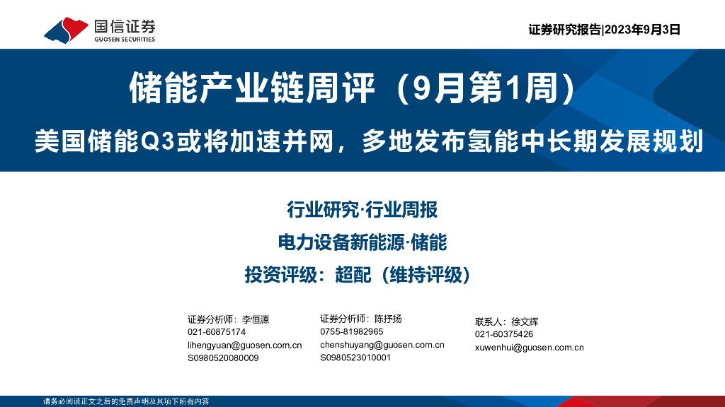 国信证券:储能产业链周评(9月第1周):美国储能Q3或将加速并网,多地发布氢能中长期发展规划.pdf