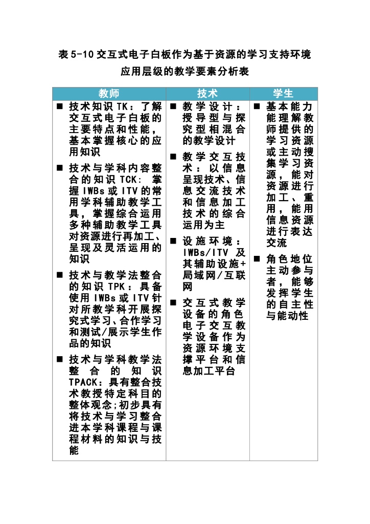 《现代教育技术应用》教学课件-交互式电子白板作为基于资源的学习支持环境应用层级的教学要素分析表.pdf