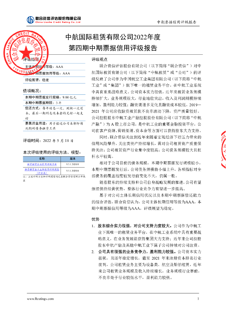 联合资信:中航国际租赁有限公司2022年度第四期中期票据信用评级报告.pdf