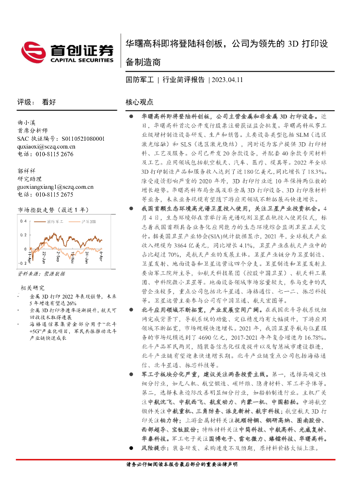首创证券:国防军工行业简评报告:华曙高科即将登陆科创板,公司为领先的3D打印设备制造商.pdf
