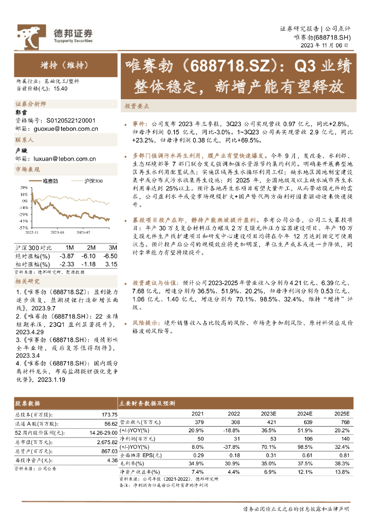 德邦证券:唯赛勃(688718)-Q3业绩整体稳定,新增产能有望释放.pdf