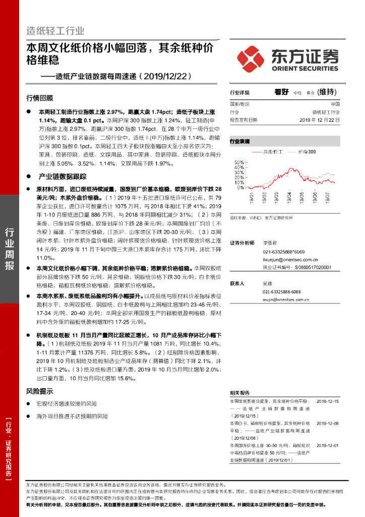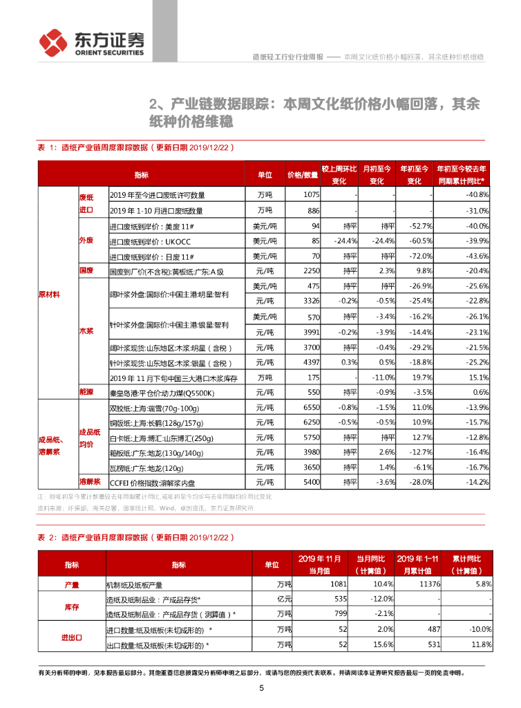 东方证券:造纸产业链数据每周速递:本周文化纸价格小幅回落,其余纸种价格维稳.pdf