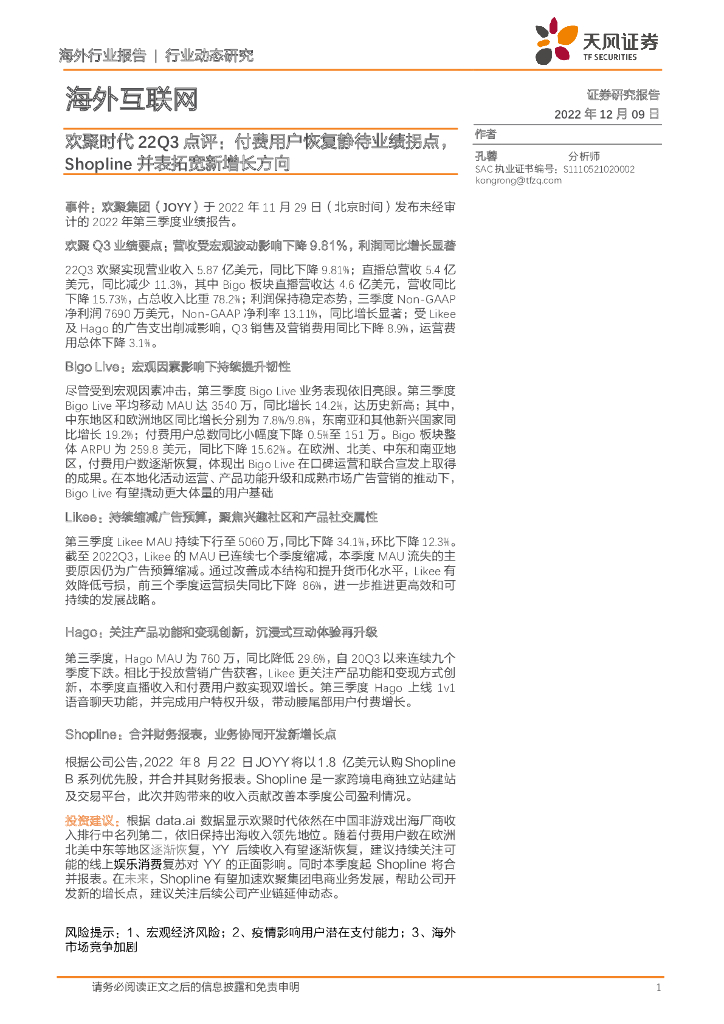 天风证券:海外互联网:欢聚时代22Q3点评:付费用户恢复静待业绩拐点,Shopline并表拓宽新增长方向.pdf