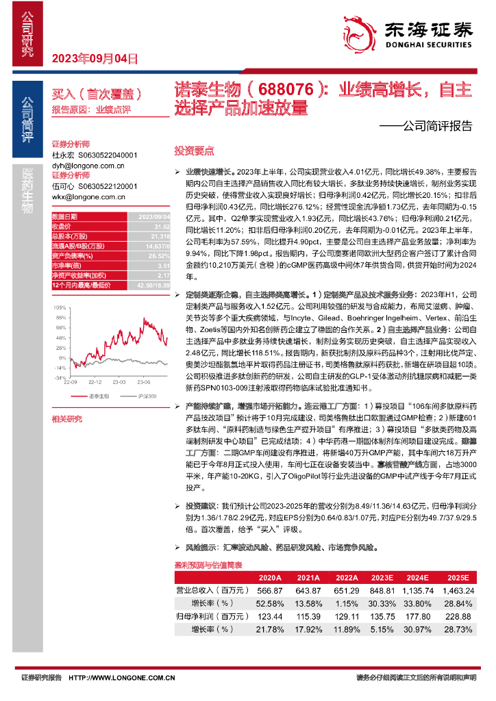 东海证券:诺泰生物(688076)-公司简评报告:业绩高增长,自主选择产品加速放量.pdf