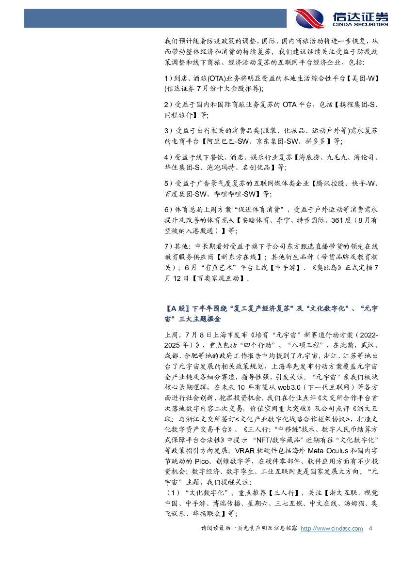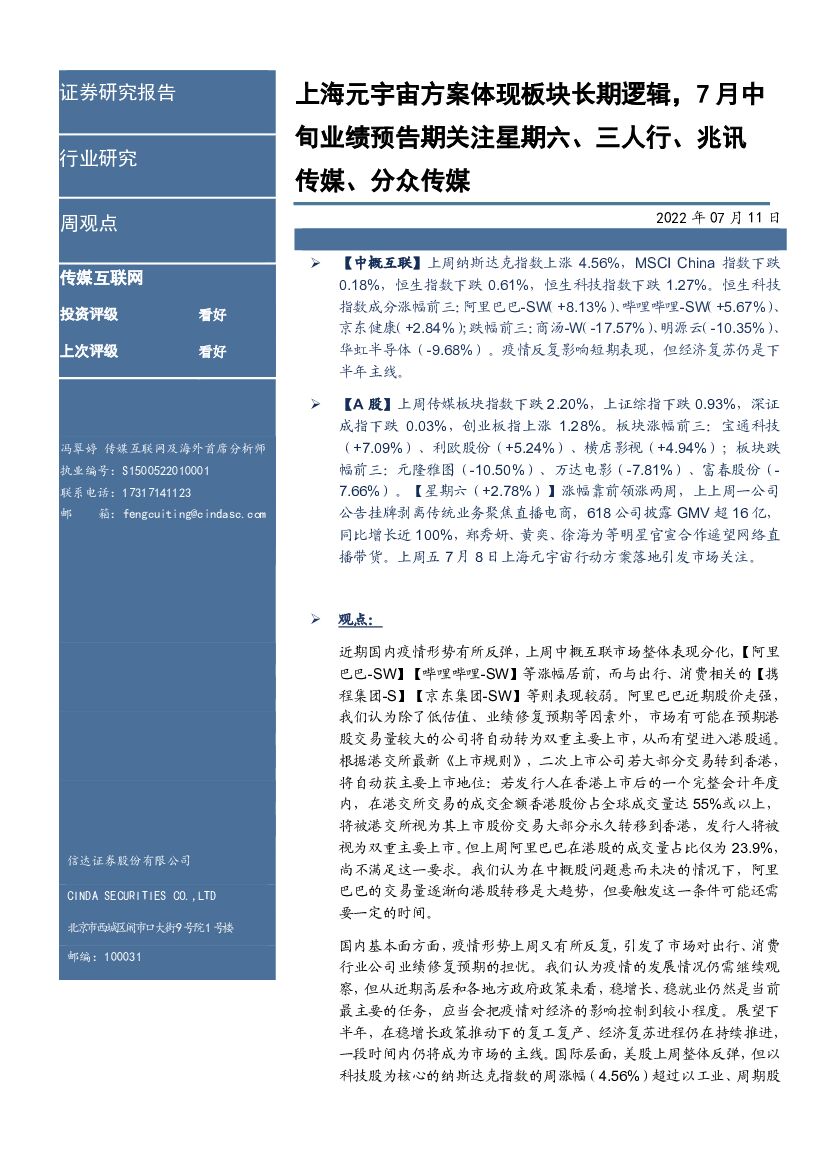 信达证券:传媒互联网及海外周观点:上海元宇宙方案体现板块长期逻辑,7月中旬业绩预告期关注星期六、三人行、兆讯传媒、分众传媒.pdf