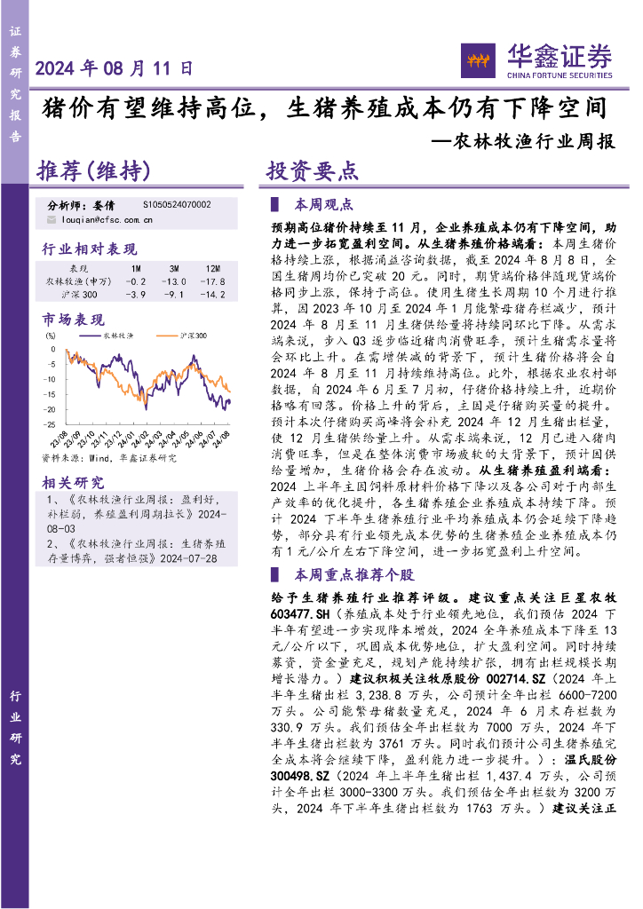 华鑫证券:农林牧渔行业周报:猪价有望维持高位,生猪养殖成本仍有下降空间.pdf