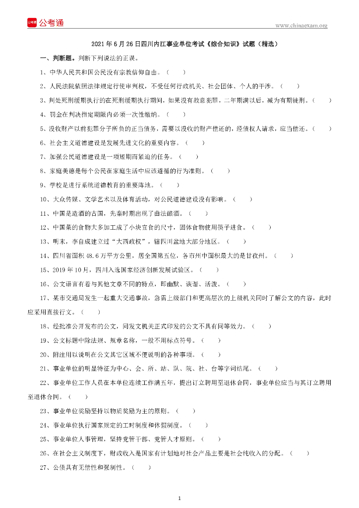 2021年6月26日四川内江事业单位考试《综合知识》试题(精选).pdf