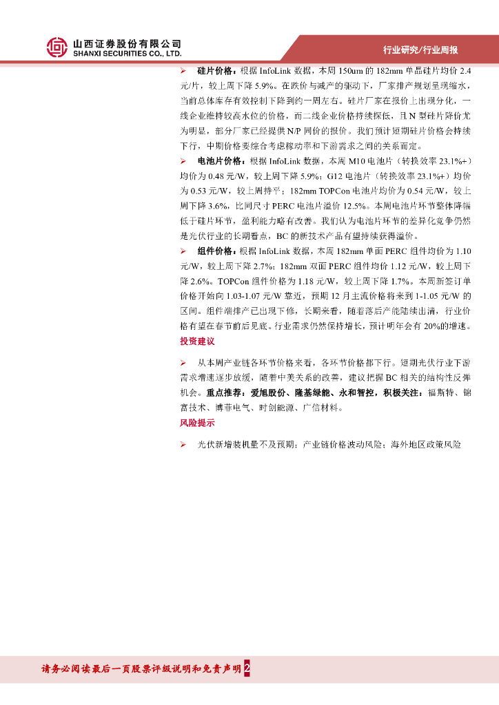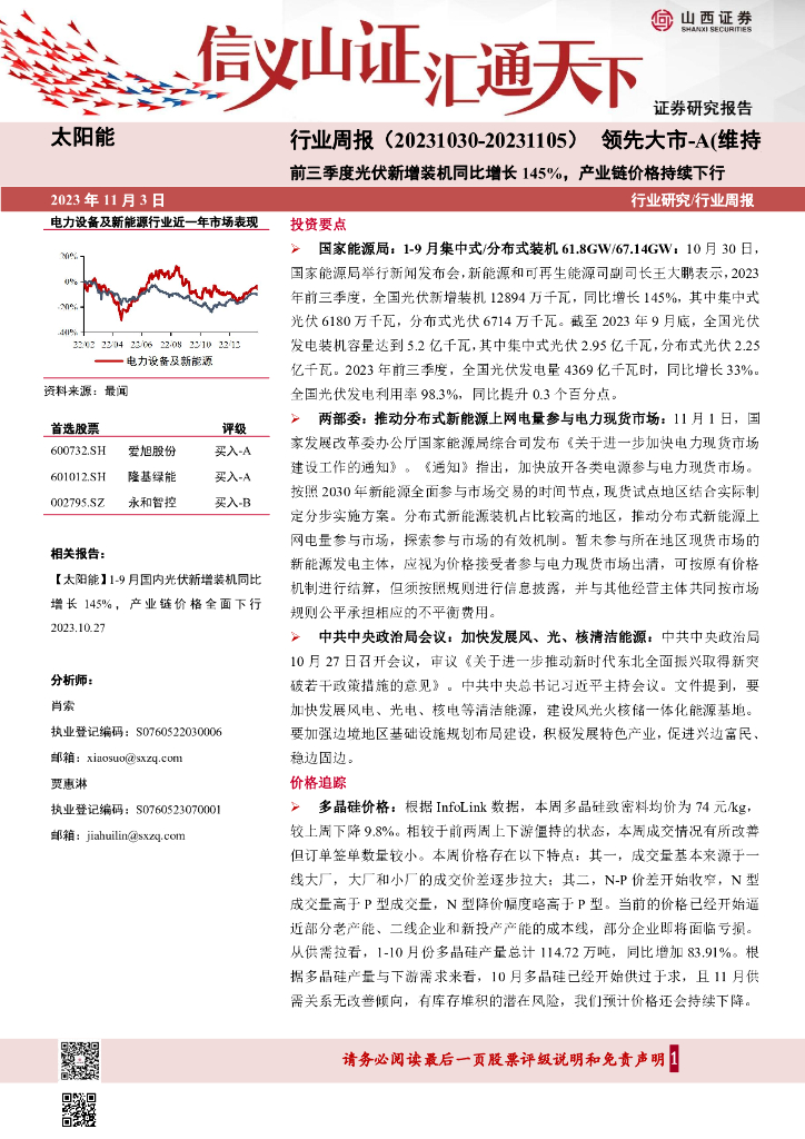 山西证券:太阳能行业周报:前三季度光伏新增装机同比增长145%,产业链价格持续下行.pdf