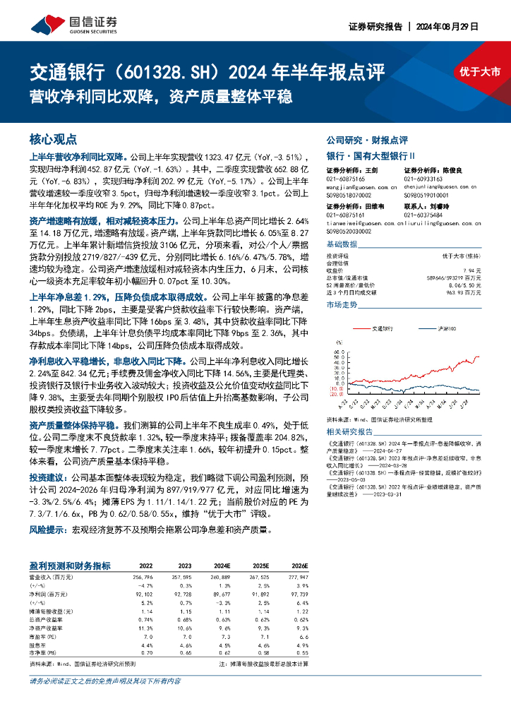 国信证券:交通银行(601328)-2024年半年报点评:营收净利同比双降,资产质量整体平稳.pdf