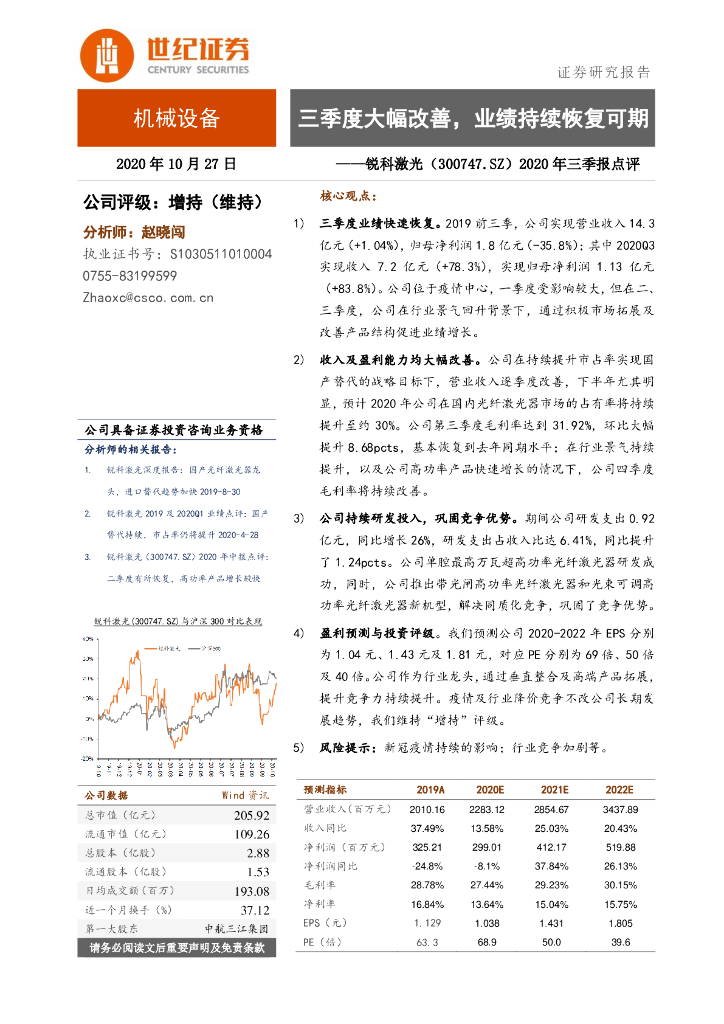 世纪证券:锐科激光(300747)-2020年三季报点评:三季度大幅改善,业绩持续恢复可期.pdf