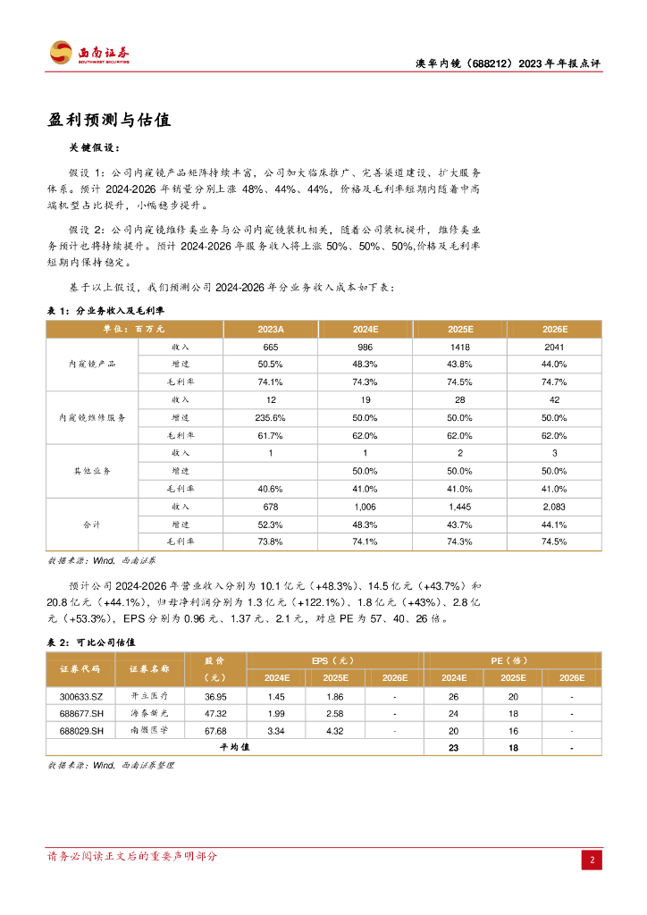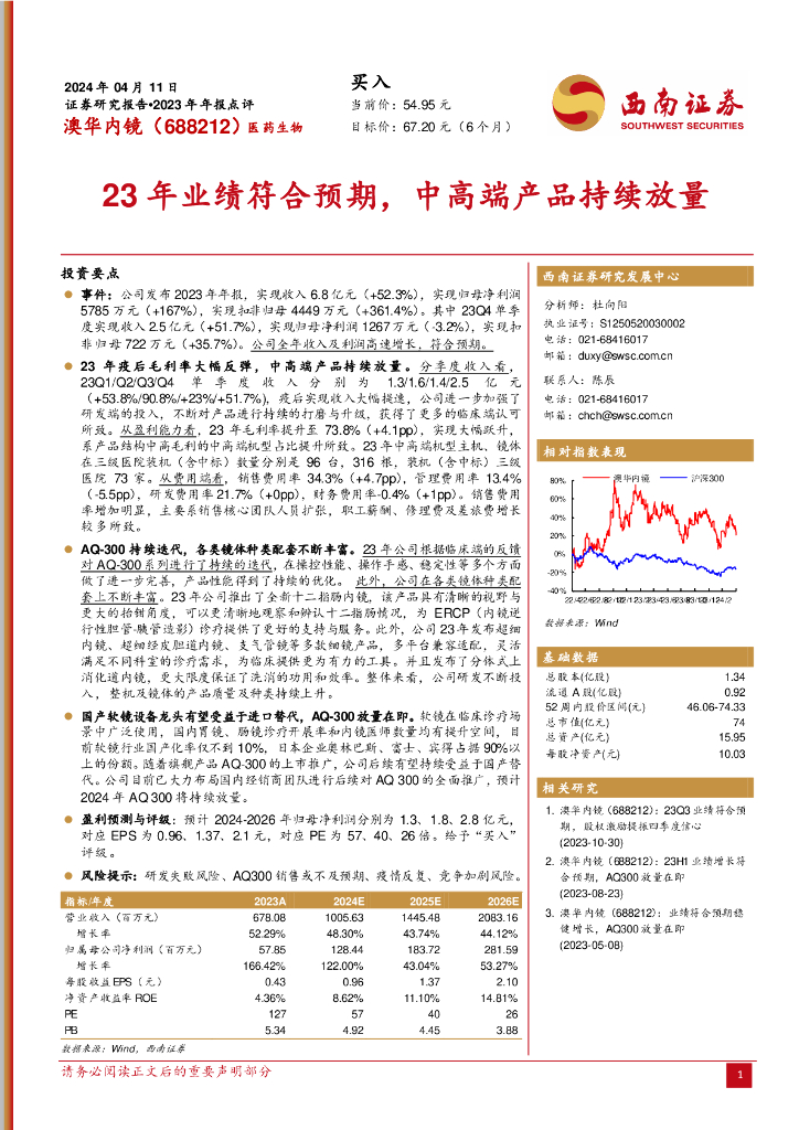 西南证券:澳华内镜(688212)-2023年年报点评:23年业绩符合预期,中高端产品持续放量.pdf