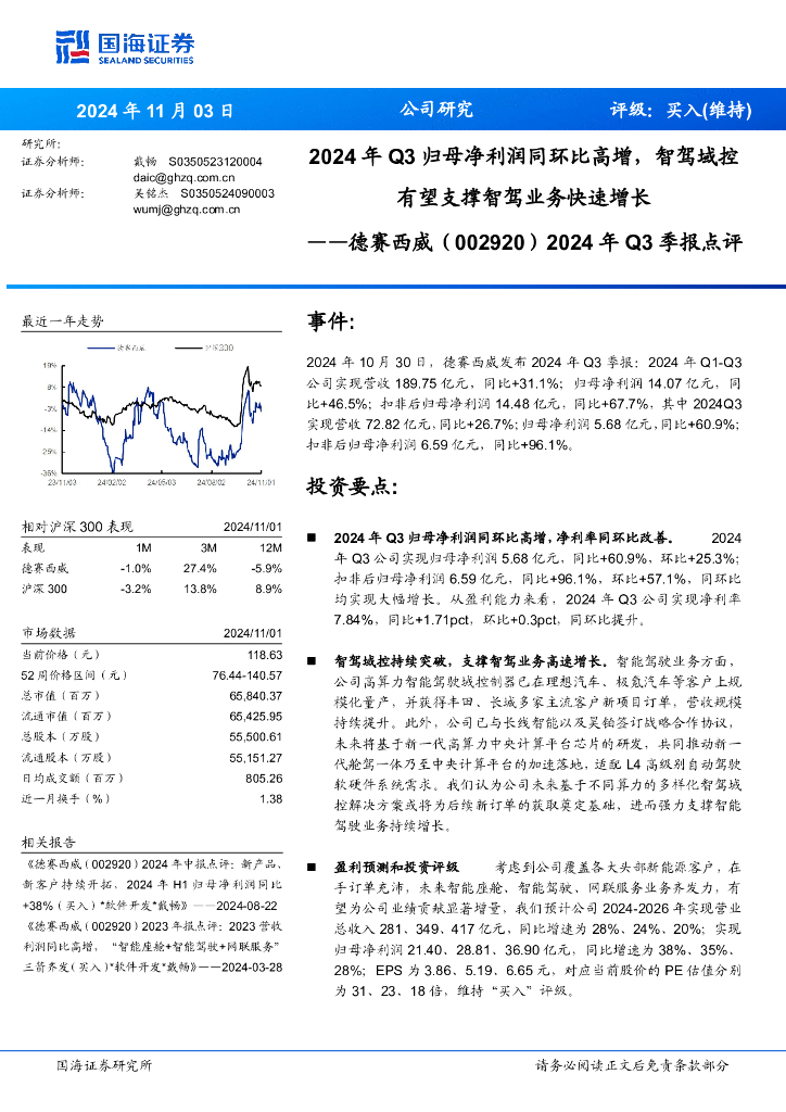 国海证券:德赛西威(002920)-2024年Q3季报点评:2024年Q3归母净利润同环比高增,智驾域控有望支撑智驾业务快速增长.pdf