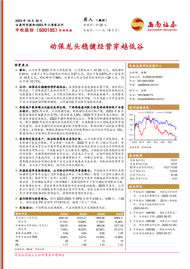 西南证券:中牧股份(600195)-2023年三季报点评:动保龙头稳健经营穿越低谷.pdf