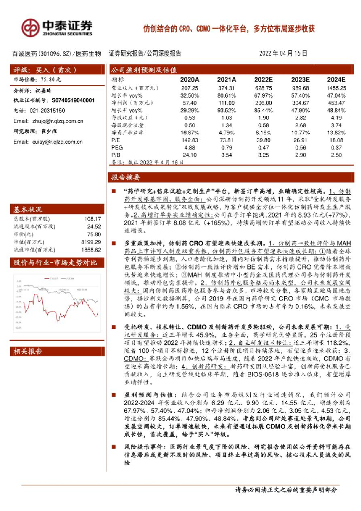 中泰证券:百诚医药-301096-仿创结合的CRO、CDMO一体化平台,多方位布局逐步收获.pdf