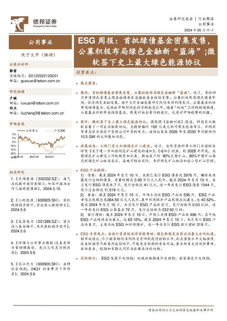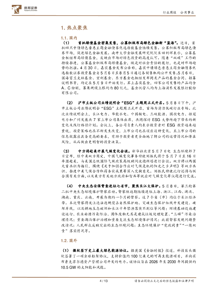 德邦证券:公用事业行业ESG周报:首批绿债基金密集发售,公募积极布局绿色金融新“蓝海”;微软签下史上最大绿色能源协议.pdf
