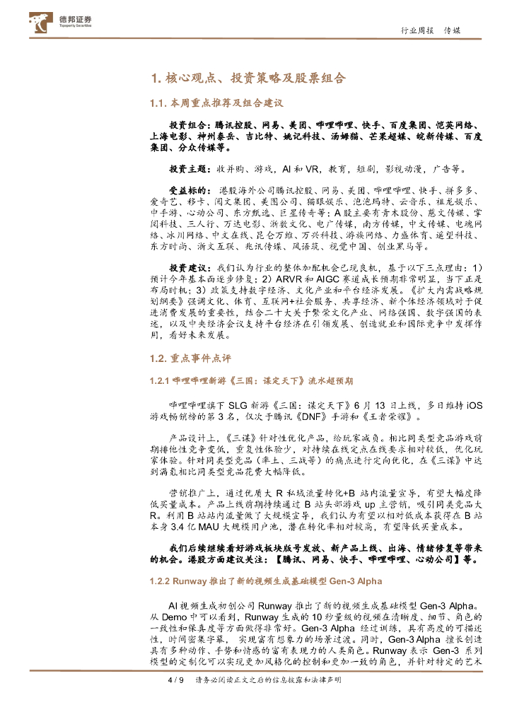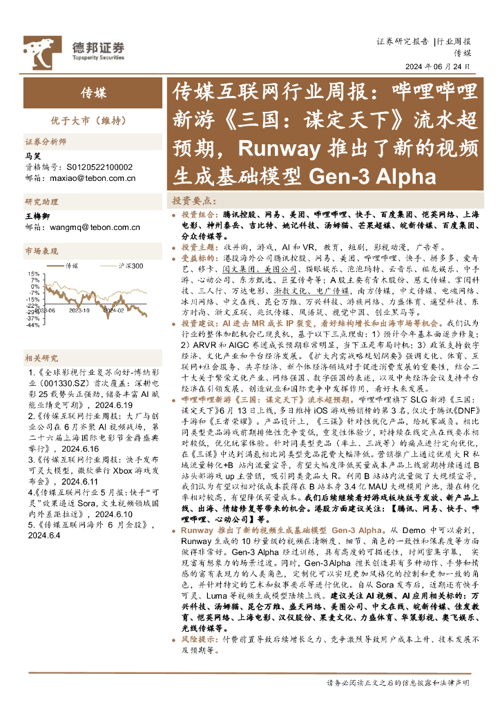 德邦证券:传媒互联网行业周报:哔哩哔哩新游《三国,谋定天下》流水超预期,Runway推出了新的视频生成基础模型Gen-3Alpha.pdf