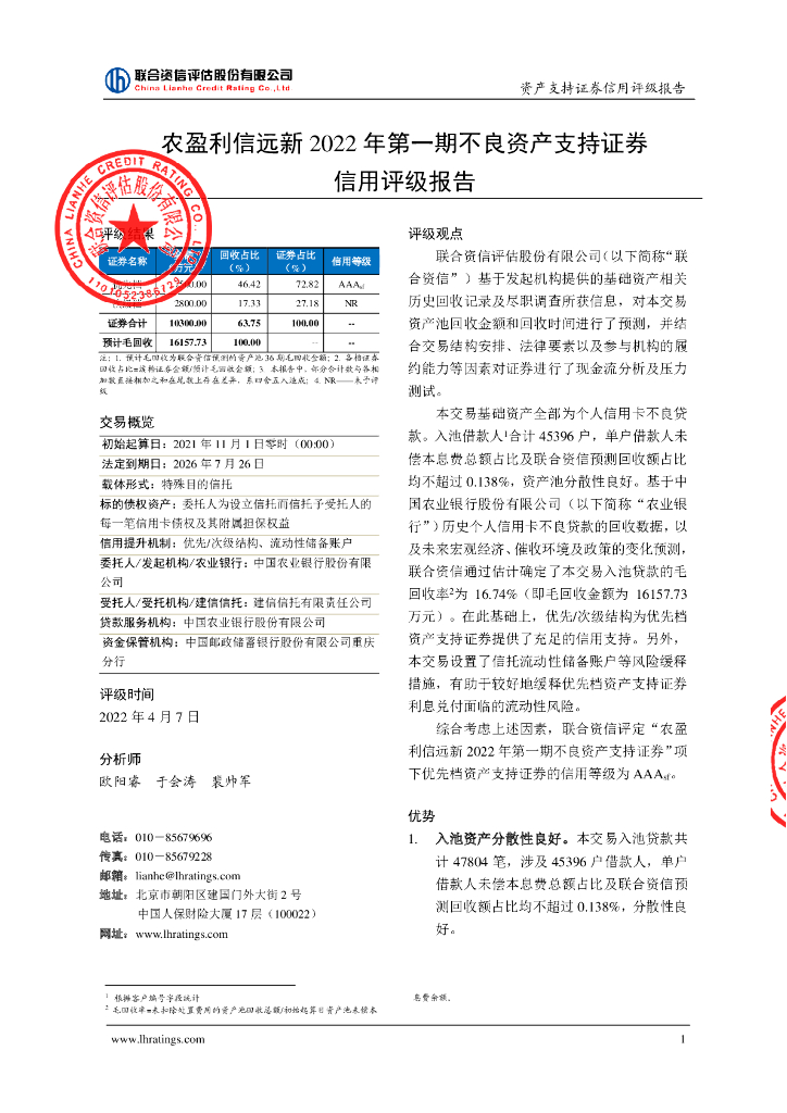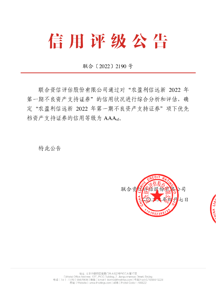 联合资信:农盈利信远新2022年第一期不良资产支持证券信用评级报告及跟踪评级安排-联合资信.pdf