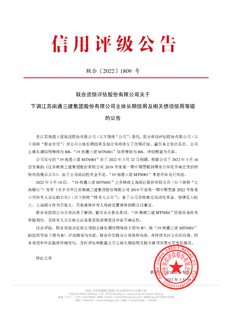 联合资信:联合资信评估股份有限公司关于下调江苏南通三建集团股份有限公司主体长期信用及相关债项信用等级的公告.pdf