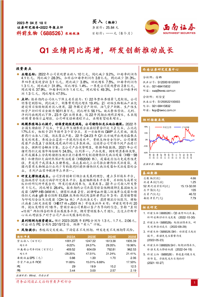 西南证券:科前生物(688526)-Q1业绩同比高增,研发创新推动成长.pdf