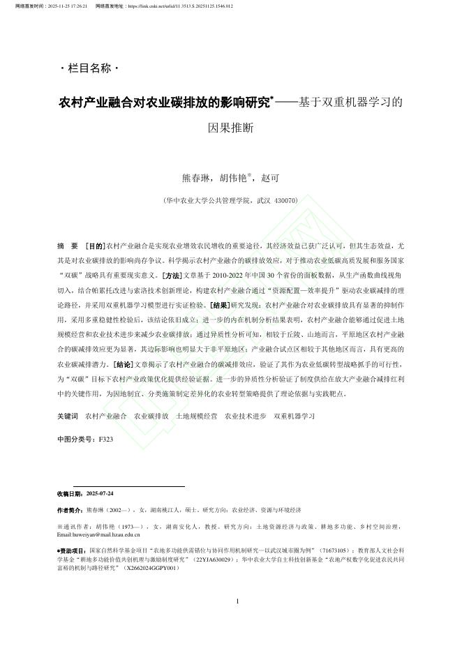 熊春琳:农村产业融合对农业碳排放的影响研究-基于双重机器学习的因果推断.pdf