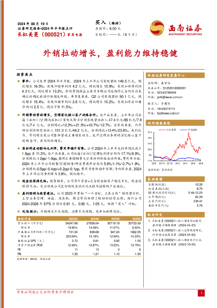 西南证券:长虹美菱(000521)-2024年半年报点评:外销拉动增长,盈利能力维持稳健.pdf