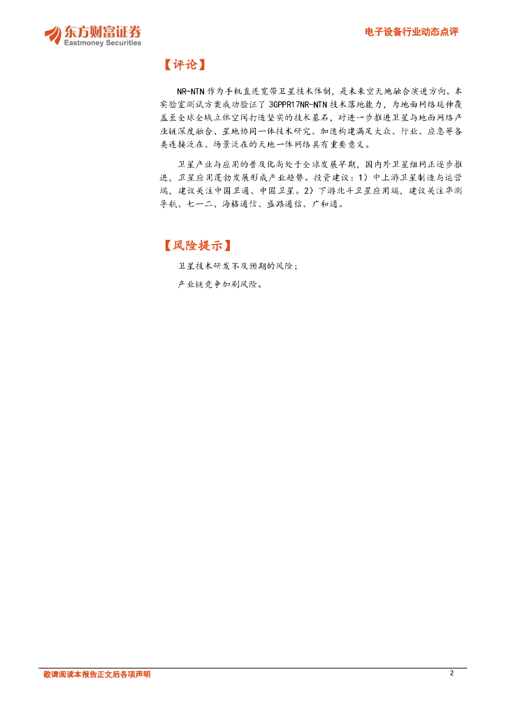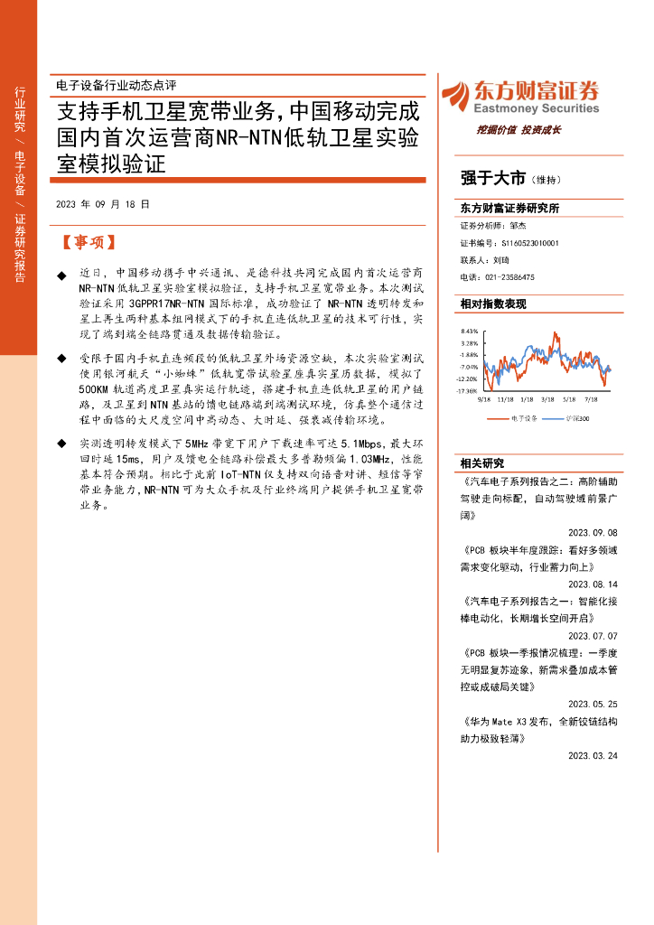 东方财富证券:电子设备行业动态点评:支持手机卫星宽带业务,中国移动完成国内首次运营商NR-NTN低轨卫星实验室模拟验证.pdf